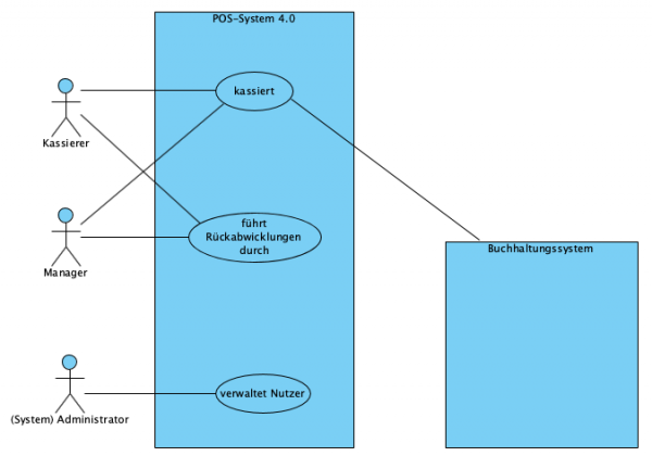 Ergänzung des Diagramms: Die „Männchen“ stellen hier die Rollen des Kassierers, des Manager und des System-Administrators da zusammen mit dem Buchhaltungs-System sind sie die Akteure in diesem Use Cases-Diagramm. Das Buchhaltungssystem als weiteres System kann regelmässig Abfragen stellen, um zum Beispiel Verkaufszahlen eines bestimmten Artikels, Tages, Woche oder Monat auszugeben. Beide Systeme, also POS-System und das Buchhaltungssystem sind dabei eigenständig anzusehen und haben ihren eigens abgegrenzten Raum (System-Boundaries).