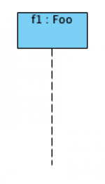 Die rechte stehende UML-Notation zeigt wie oben eine Box mit einer Lebenslinie. Auch hier steht die Box für die Klasse Foo, nur dass hier die Klasse instanziiert wurde. Hier ist f1 eine Instanz der klasse foo. In Javacode wäre die rechte Notation äquivalent mit folgender Codezeile: