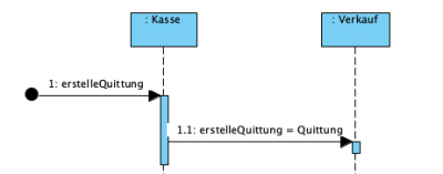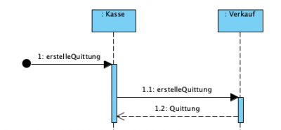 Eigene Aufrufe können wie links dargestellt auch als verschachtelte Ausführungsspezifikationsleisten (execution specification bars) dargestellt werden. In diesem Beispiel wird der Kauf an der Kasse abgebrochen. jedoch soll der Vorgang nicht verworfen, sondern protokoliert werden. Dazu findet dann ein Selbstaufruf statt, der in der Kasse in das Log-File schreiben soll, dass dieser Kauf abgebrochen wurde.